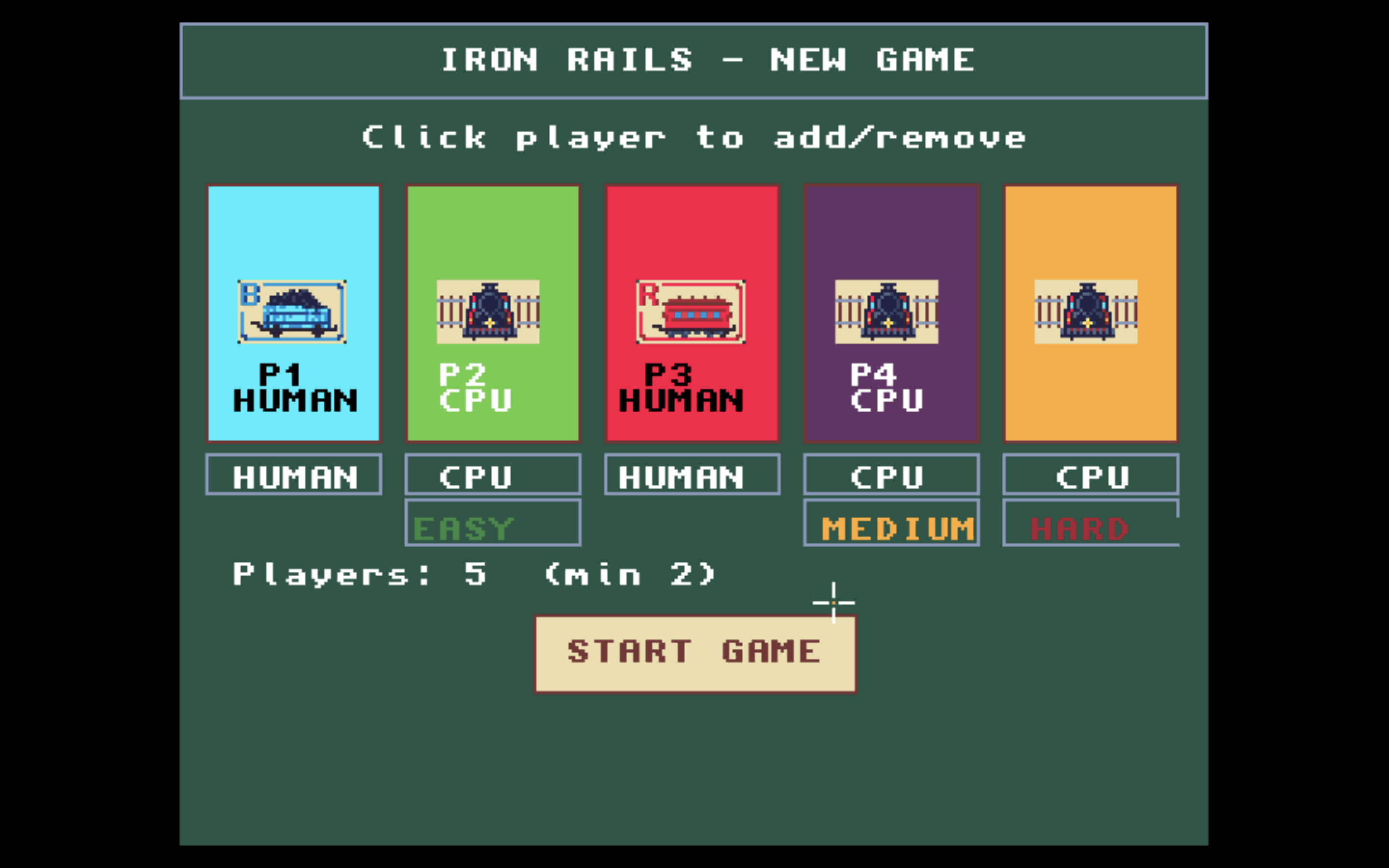 - 2–5 players with fully playable CPU opponents at Easy, Medium, and Hard difficulty